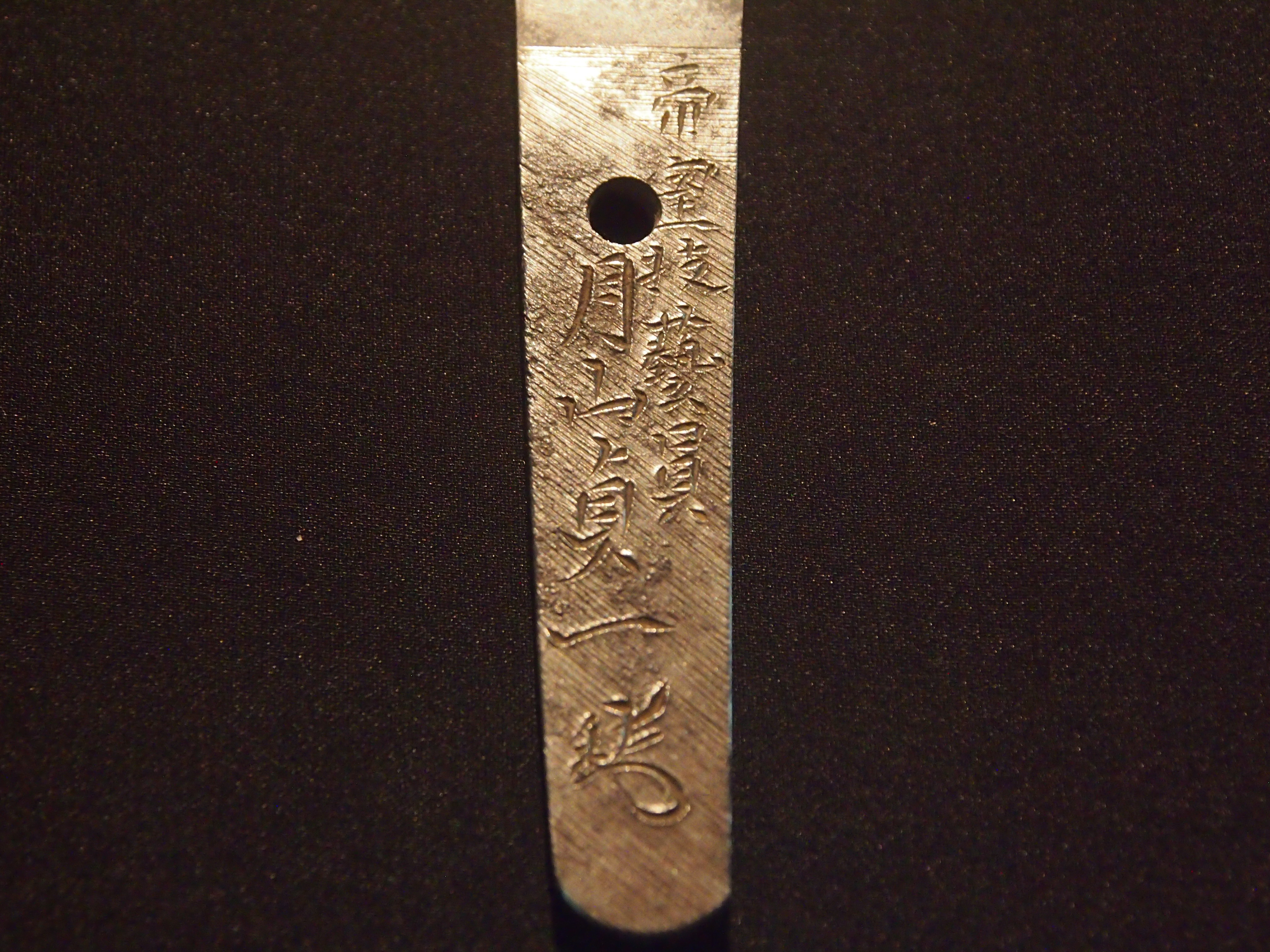 月山貞一は天保7年(1836年)江州犬上郡須越村に生まれる。七歳の時に月山貞吉の養子となり十一歳から鍛刀修業を始め、以後奥州月山に倣った綾杉肌の作刀から相州、備前、大和、山城の各伝まで幅広く作刀があり、中でも彫り物は見事で梵字、剣、護摩箸から不動明王や倶利伽羅龍まで多彩な彫り物が残されている。明治の廃刀令の後も刀工の道を歩み続け、世相により軍刀の需要が増したため身幅の狭い軍刀身で備前伝の丁子乱の作が多く残されている。そんな中、明治39年4月4日帝室技芸員に任命され、以後大正7年84歳で没するまで68年に渡り刀工として鍛刀する。 本作は地鉄よく詰み、刃文は小互ノ目連なり匂口よく締まり刃の冴えた作となっており、大正四年の年紀が入った貞一の最晩年作の短刀であろう。拵は全体に金が施された華美な拵となっている。