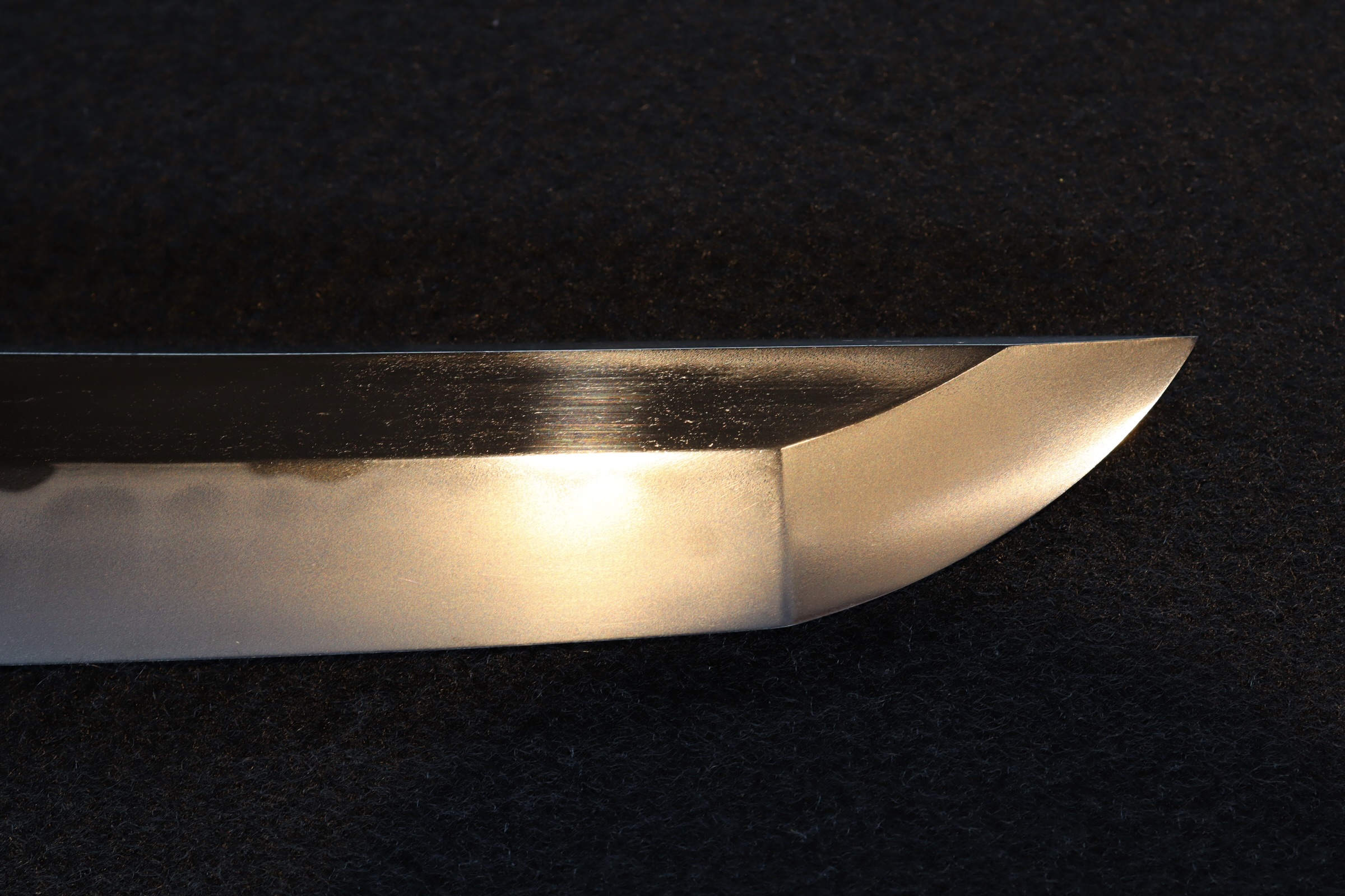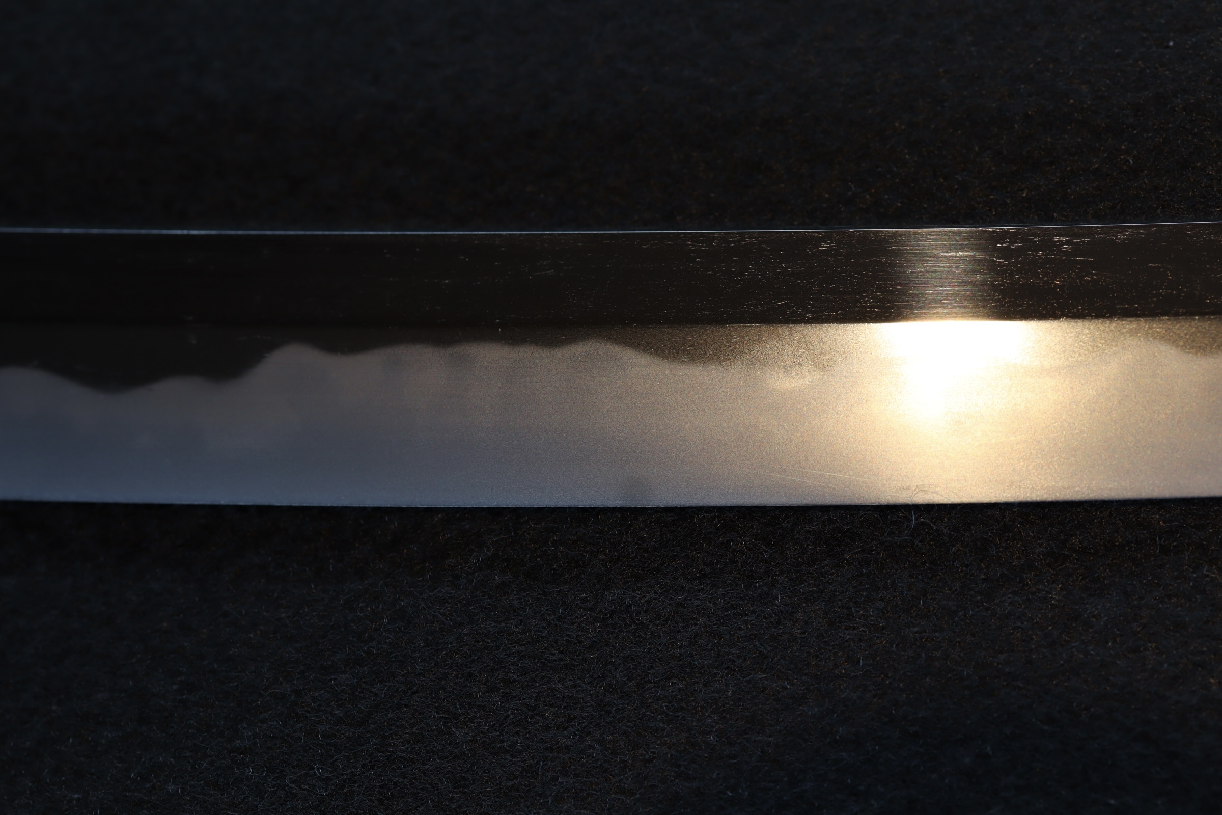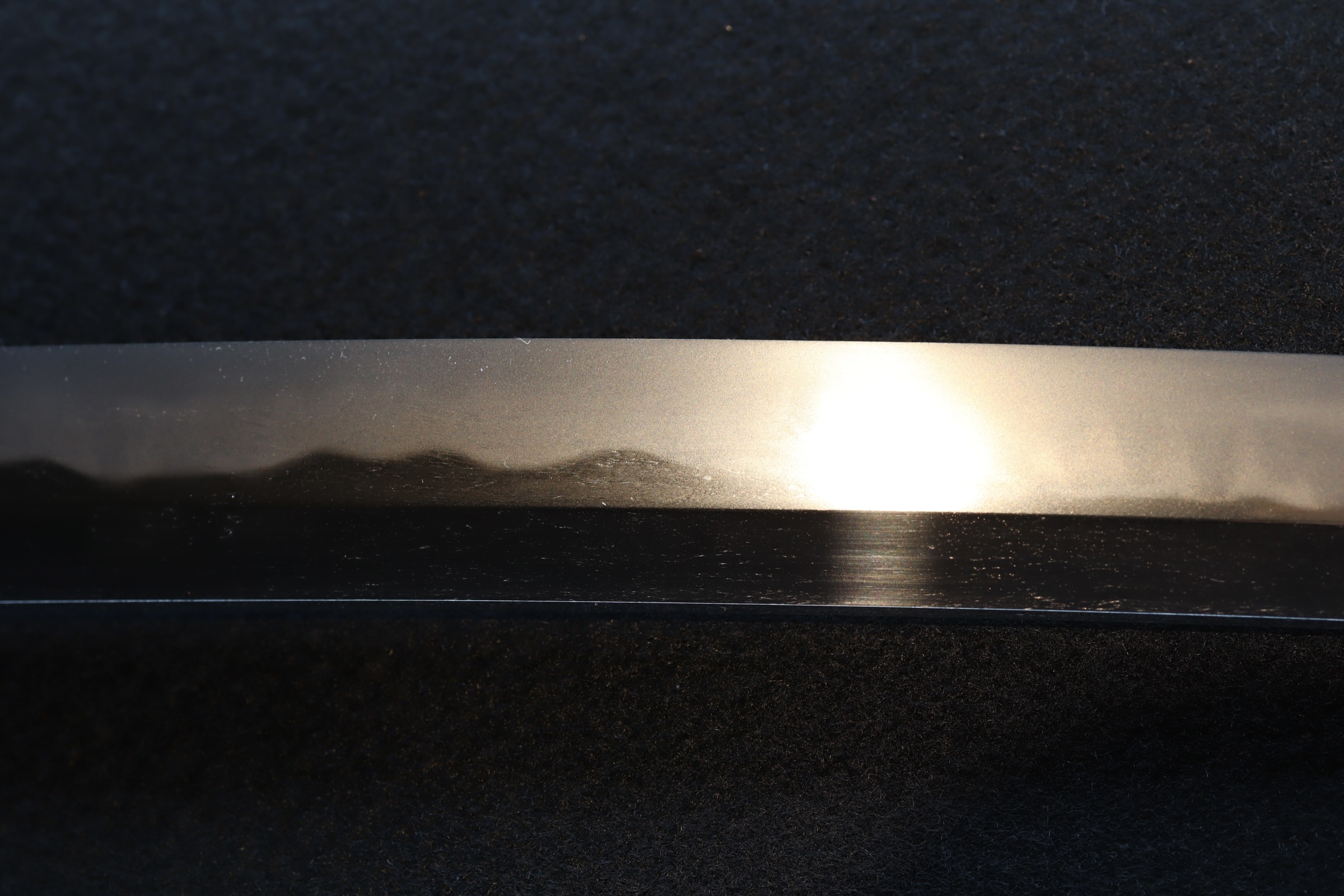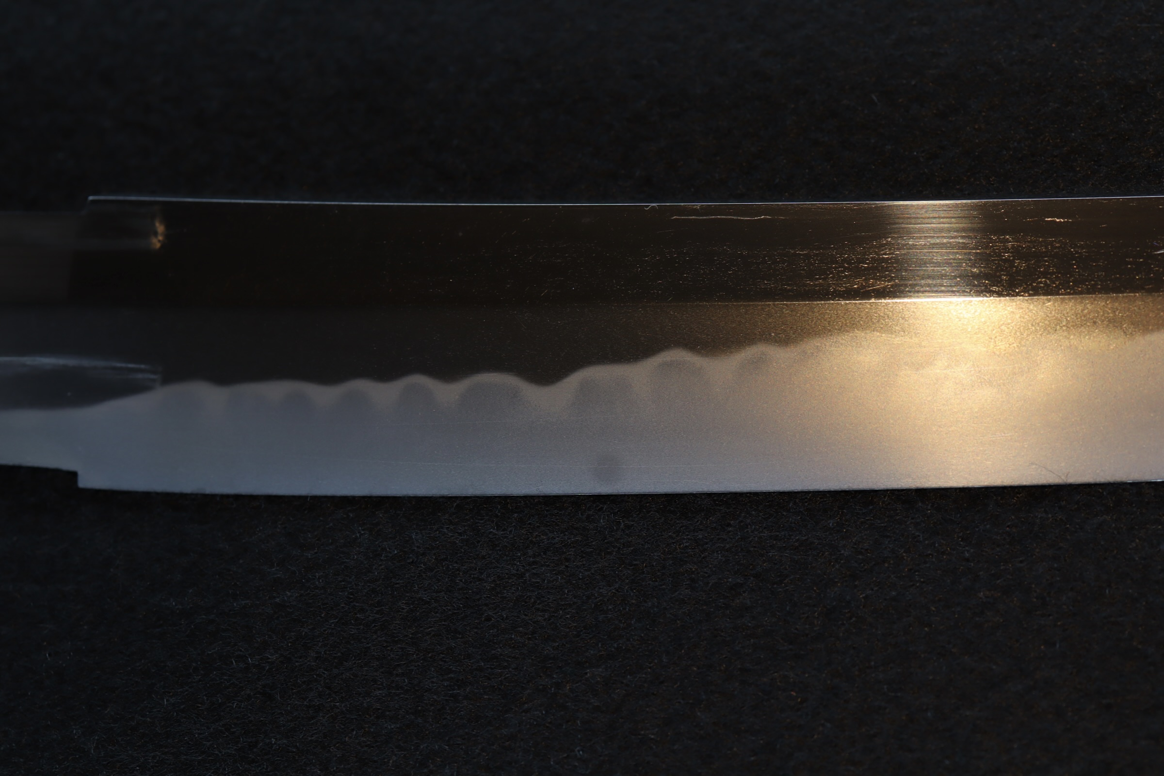 相右衛門吉家(広貞)の次男。初銘広則。寛永十一年播磨大掾を受領し、忠国と改め、のちに播磨守に転ず。 小城鍋島家に抱えられ小城藩工ととなり橋本播磨と号す。老後は入道し播磨入道休鉄と打つ。元禄四年四月二十二日没。 銘は初期の寛永頃は播磨の磨の字の下を「石」ではなく「手」と切り「播摩」となり、正保頃より「磨」と切る。 傍肥前の中では初代正広に比肩するほどの上手。 本作は播“磨”と切り、出来は反りがよくつき、地鉄はよく詰み、刃文は丁子刃が高低に焼かれ一見にして 福岡一文字と見紛うほどの出来となる。金筋も入り忠国の力量が垣間見える頗る出来の良い一振りとなる。