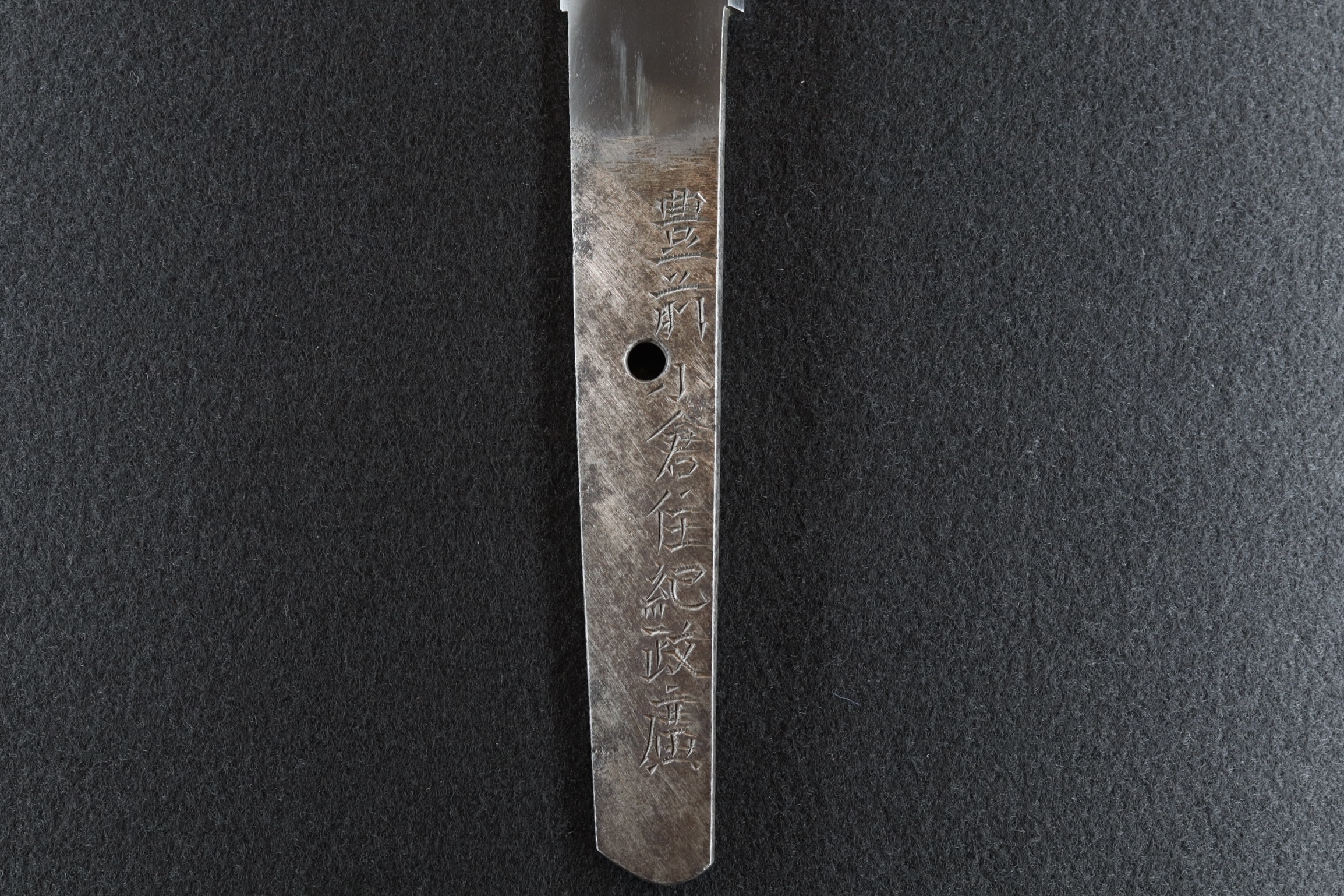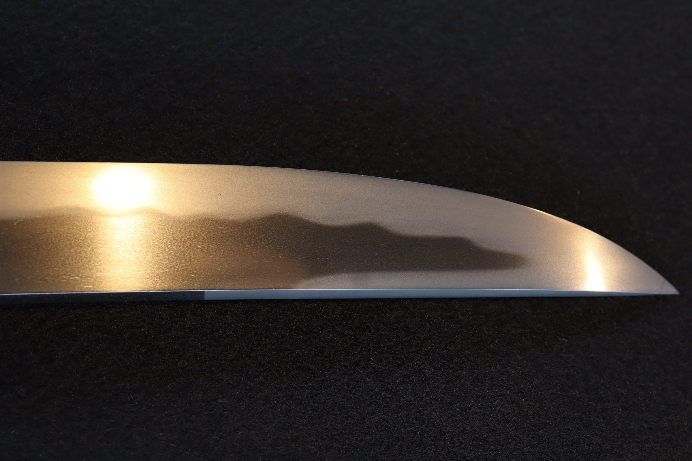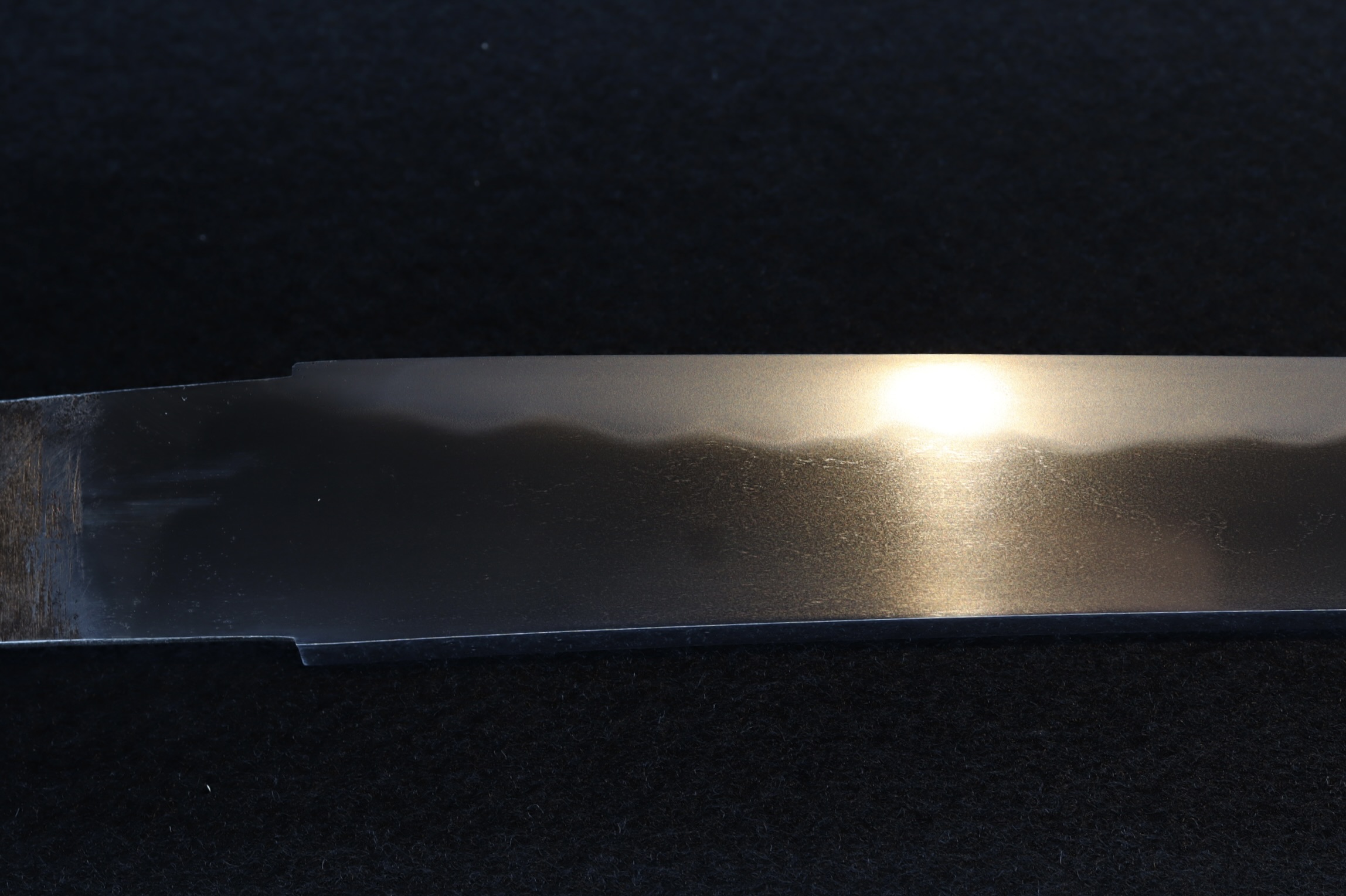 長谷川藤四郎。初銘吉広という。阿波で生まれ備前長船で作刀を学ぶ。慶應元年小倉藩に抱えられ藩工となり政広と改める。 紀姓。豊前小倉、または中津住。本作は寸の伸びる平造りの重ねの厚い造り。地鉄はよく鍛えられた精錬された肌に、刃文は 匂い口の締まった互の目が連なり、帽子は小丸に返った非常に出来の良い作刀となる。慶應三年の年期が入り、江戸時代の 終焉を迎えた激動の時代に強い意思の込められた脇指となる。