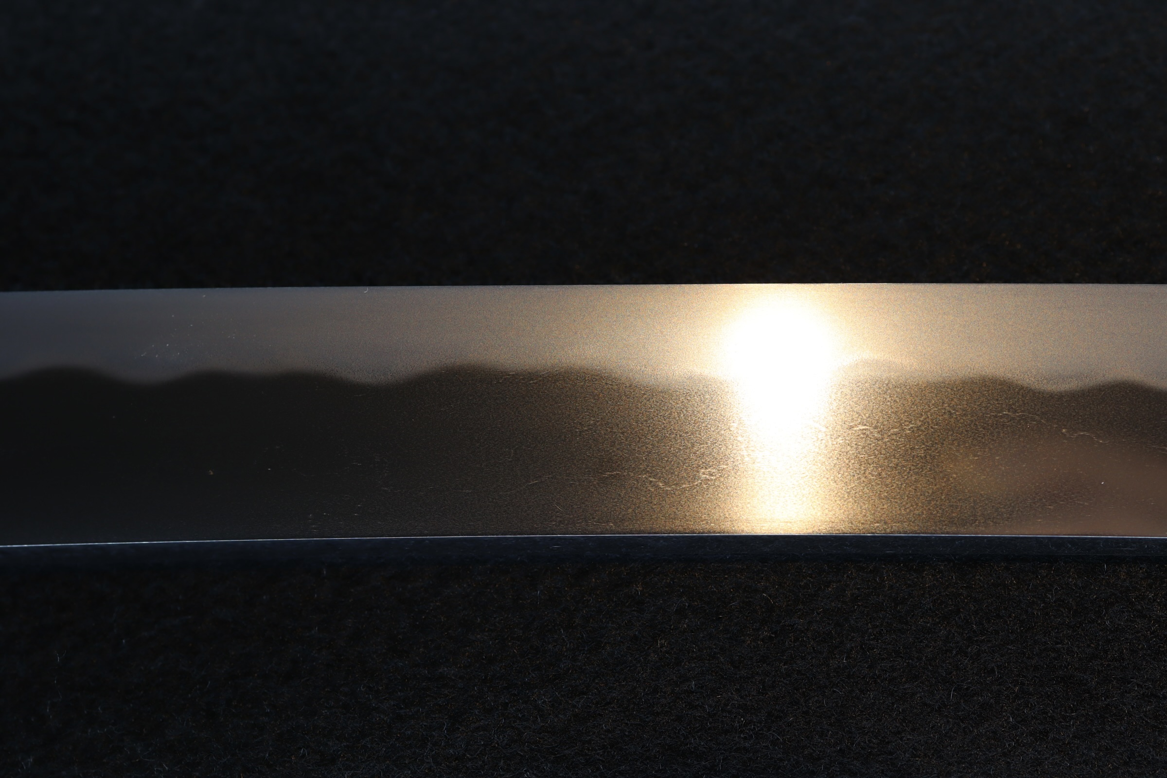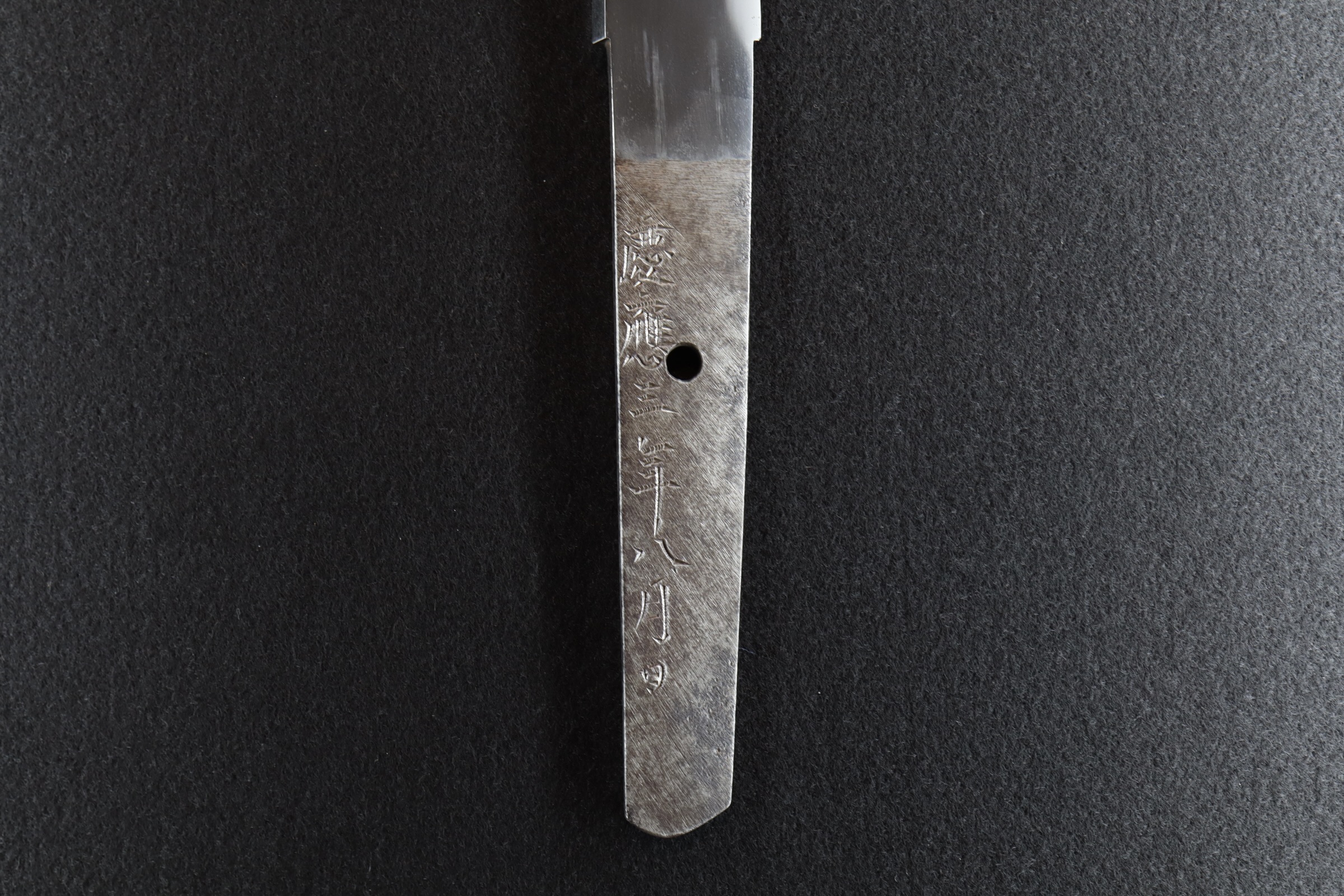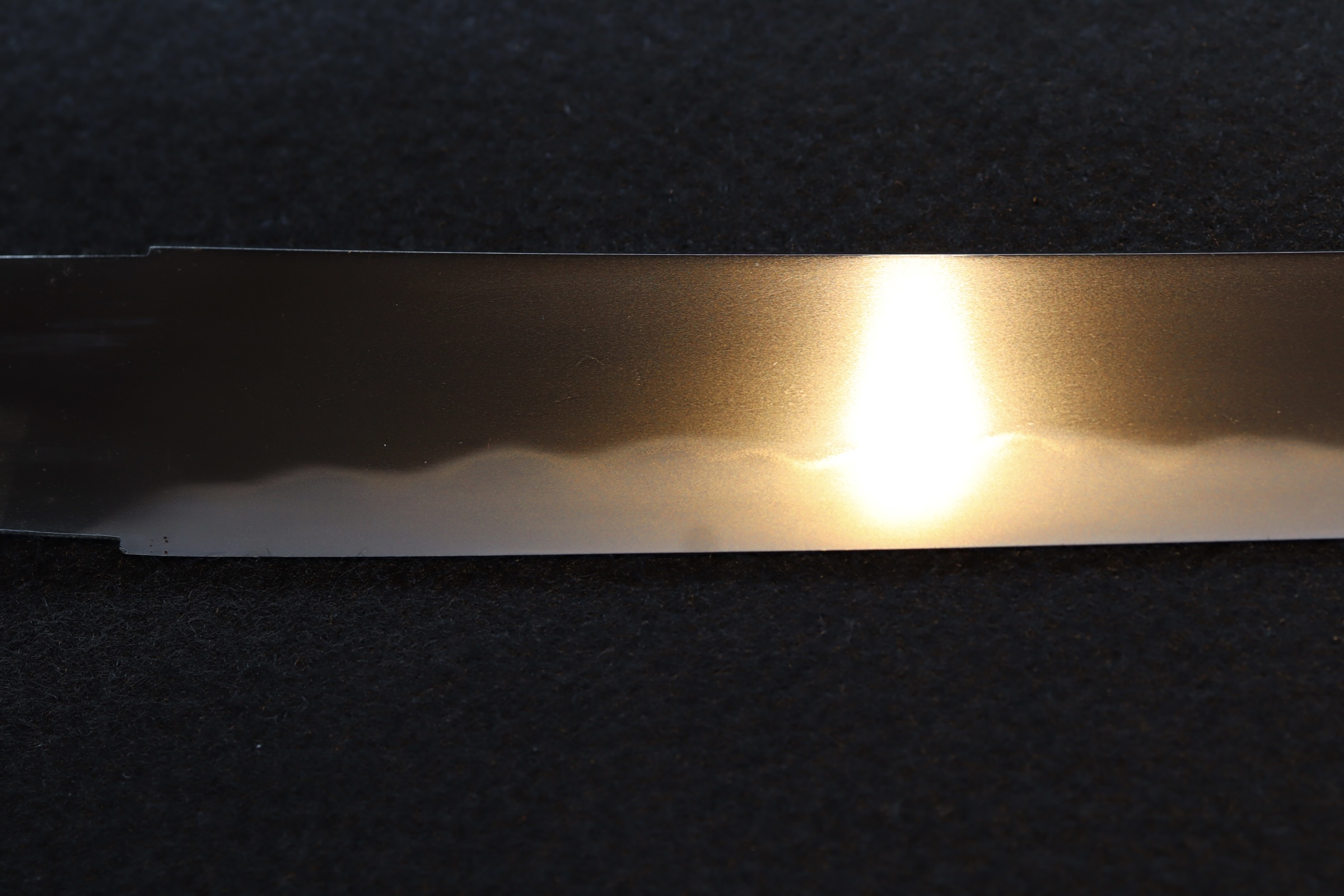 長谷川藤四郎。初銘吉広という。阿波で生まれ備前長船で作刀を学ぶ。慶應元年小倉藩に抱えられ藩工となり政広と改める。 紀姓。豊前小倉、または中津住。本作は寸の伸びる平造りの重ねの厚い造り。地鉄はよく鍛えられた精錬された肌に、刃文は 匂い口の締まった互の目が連なり、帽子は小丸に返った非常に出来の良い作刀となる。慶應三年の年期が入り、江戸時代の 終焉を迎えた激動の時代に強い意思の込められた脇指となる。
