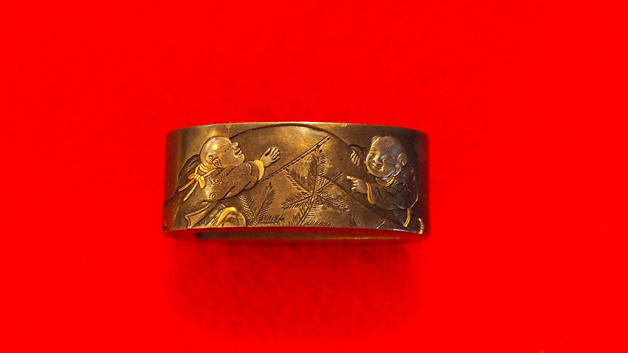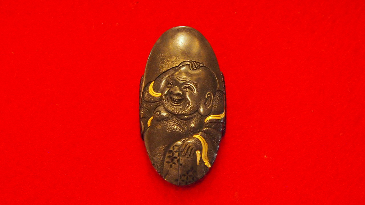 本姓は遠山氏。はじめ中村直矩に学び、のちに親戚関係の初代矩随に師事し、二十歳で浅草大音寺門前町で独立開業した。甲府や越後へ赴き、信濃国の福島や松本に移り住む。 弟子には江戸で岩間政盧、甲府で直親、越後で小栗良直などがいる。晩年は伊那谷の片桐村にて74歳で没した。本作は四分一磨き地に、一見して柔和な表情が読み取れる顔をした布袋が彫られ 唐子は顔が銀で象嵌されており幼子の肌質が感じられるような精巧な出来となっている。