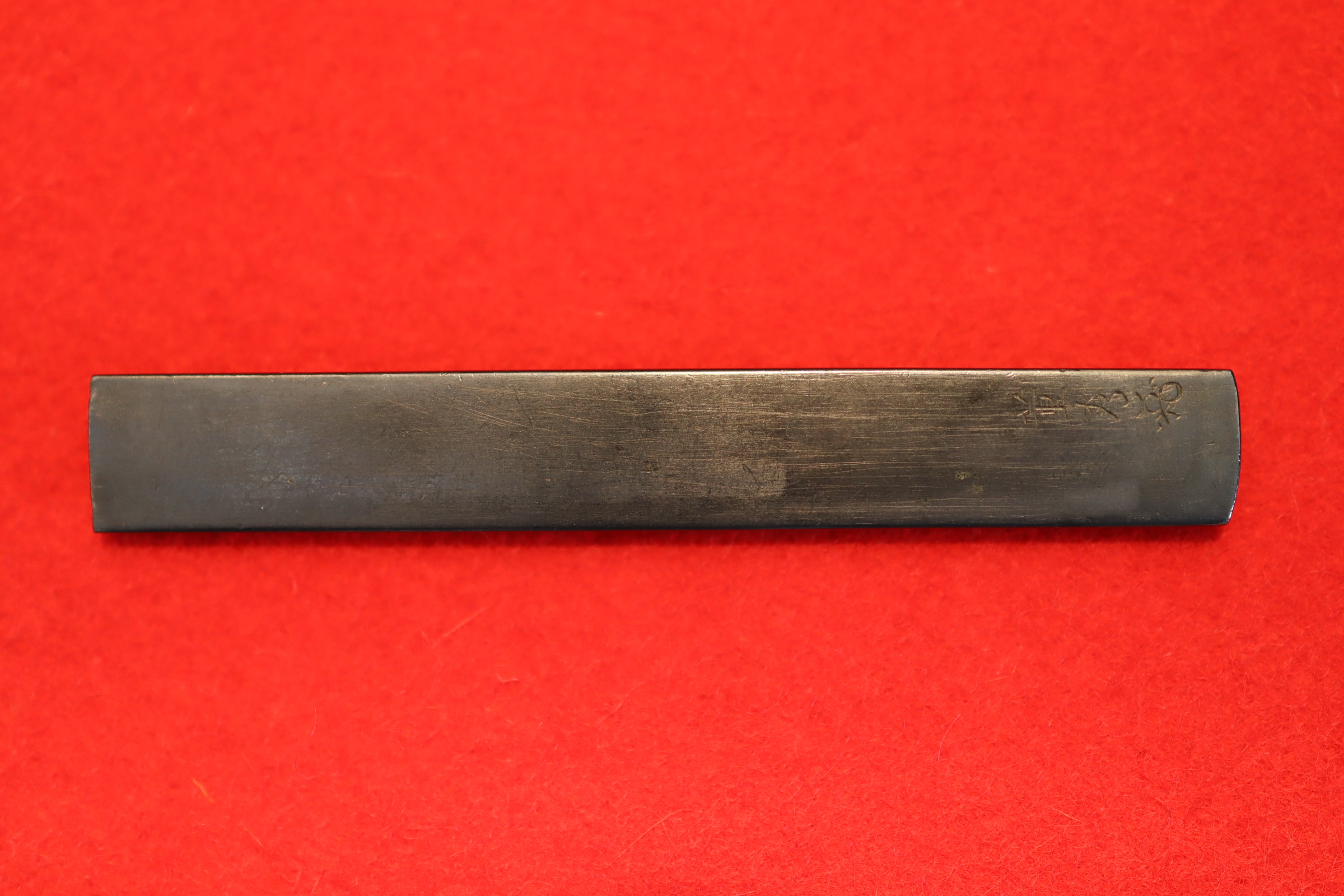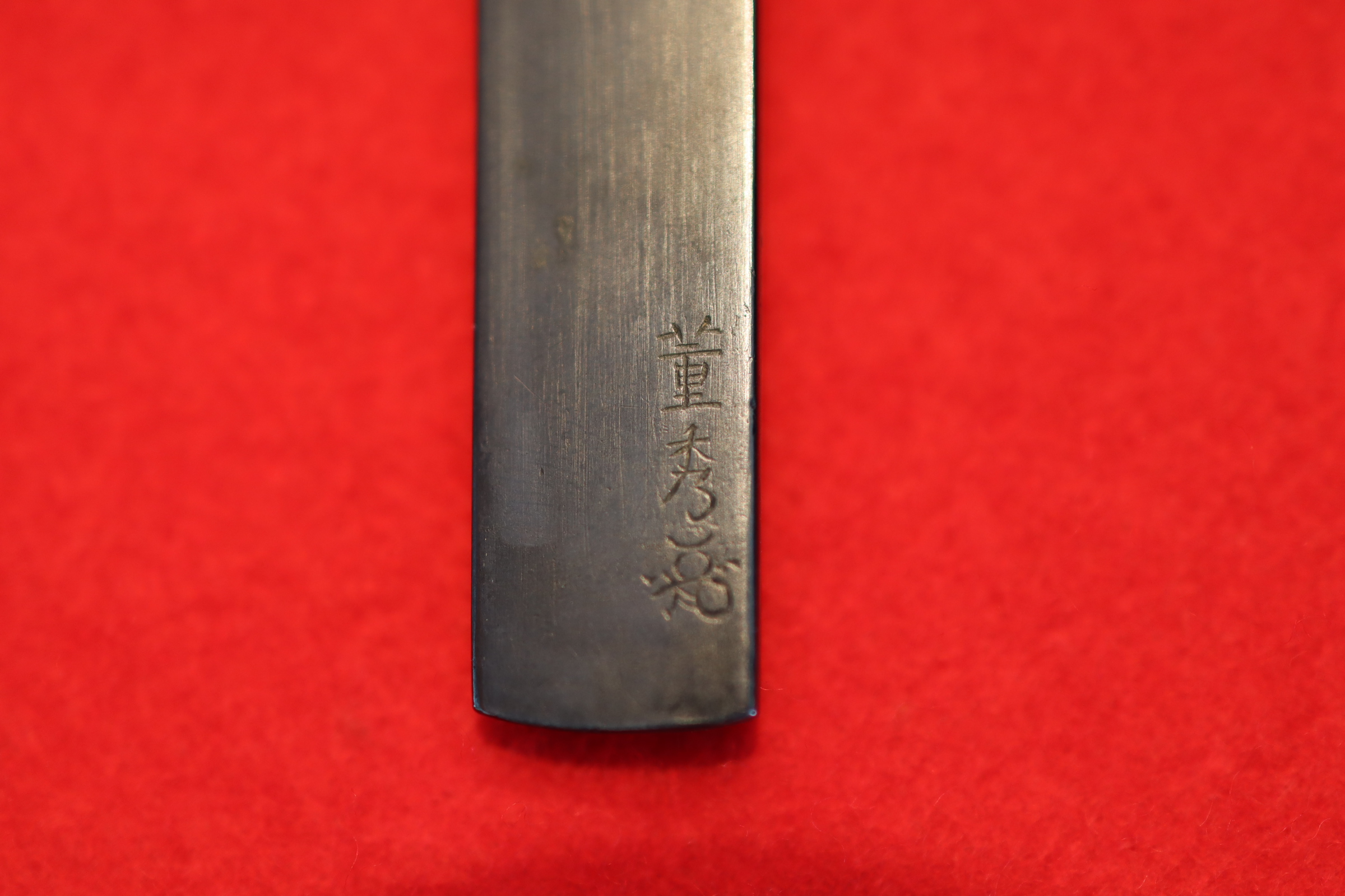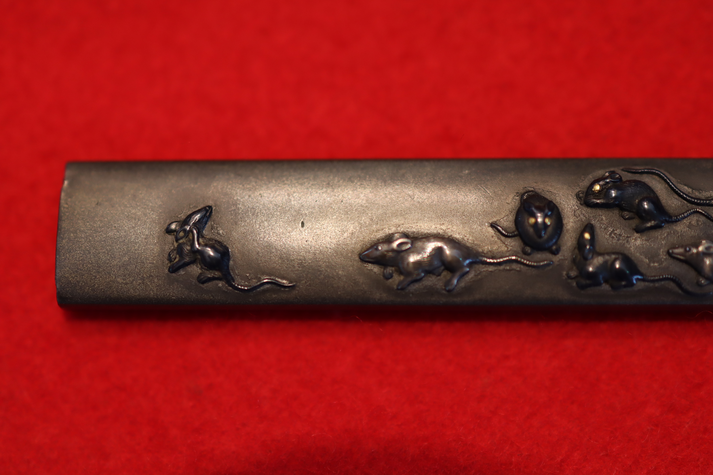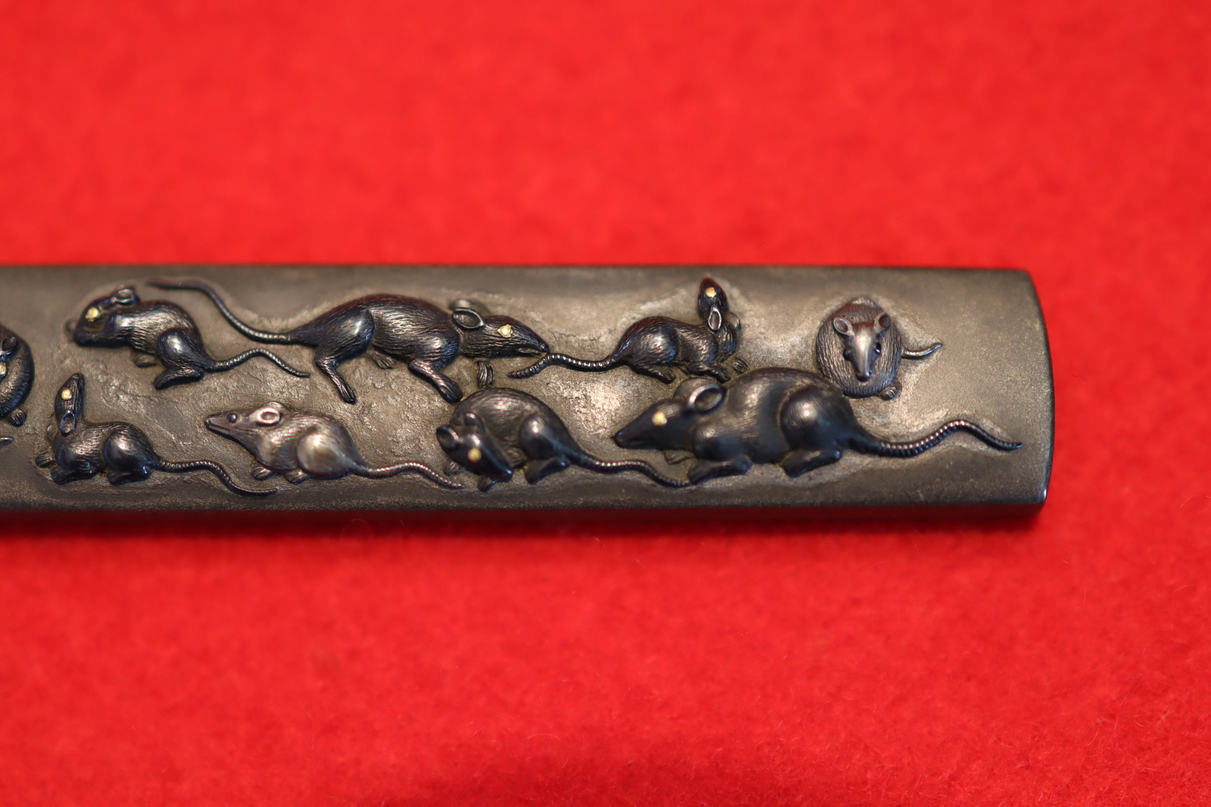 董秀(ただひで)と読む。名鑑漏れではあるが董勝、董令という金工師の作が残されており同系統か。 本作は四分一磨き地に銀と赤銅で色絵象嵌されており、鼠の目には金が施され鼠の躍動感が見事に表現されている。