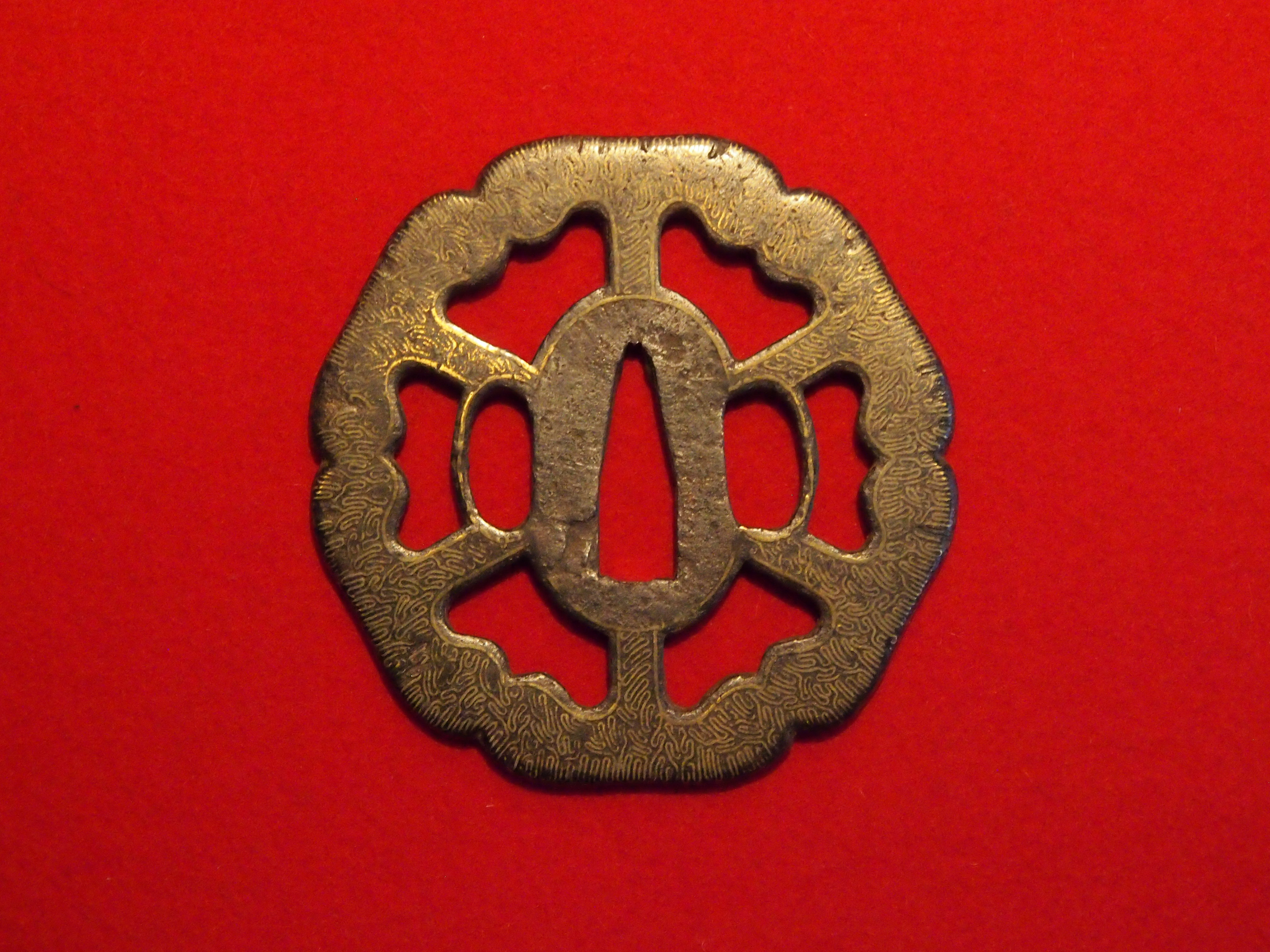 平安城象嵌は応仁鐔の造り込みを継承し、桃山期から江戸時代にかけて隆盛した。平地の鉄鐔に金や真鍮、銀を用い全体に鮮やかに象嵌されている。本作は余すところなく線象嵌が施されており、抜けも比較的少なく古色ありながらも非常に華美な作風となる。
