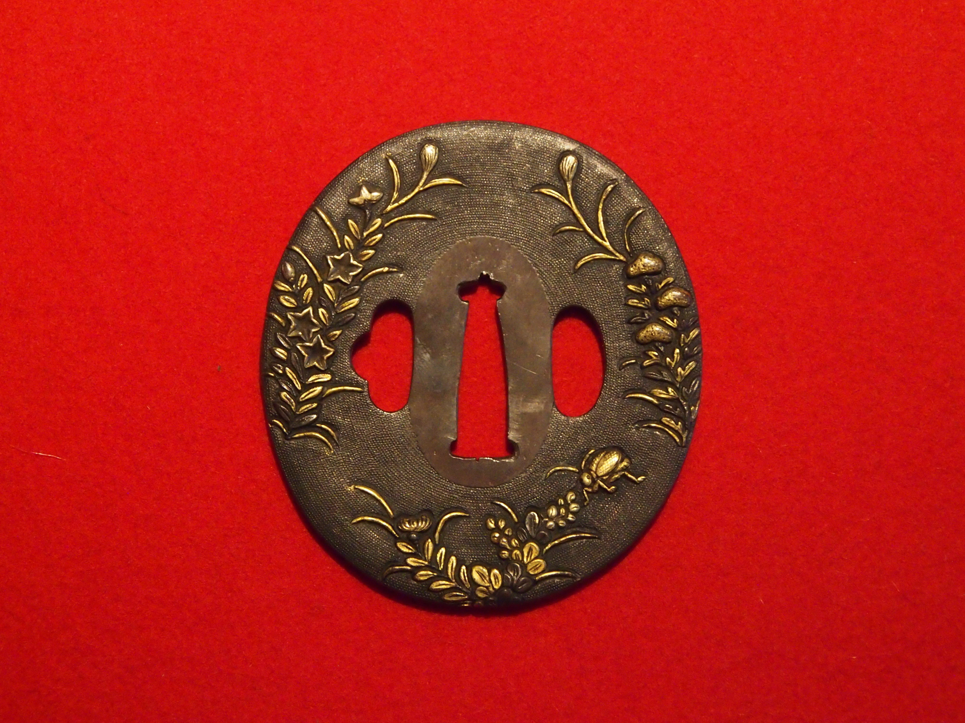 美濃鐔は室町期から派生し、良質な赤銅地に金銀をふんだんに用いて菊や撫子、桔梗などの植物の図柄を金で象嵌し非常に華美で当時の最上級の装飾品であったろうことが一見してわかる仕立てになっている。本作はおそらくは江戸時代の後期に作られた美濃鐔とおもわれ、赤銅地の質は見劣りしてしまうが、しかし拵に着ければ非常に見栄えの良い鐔となる。