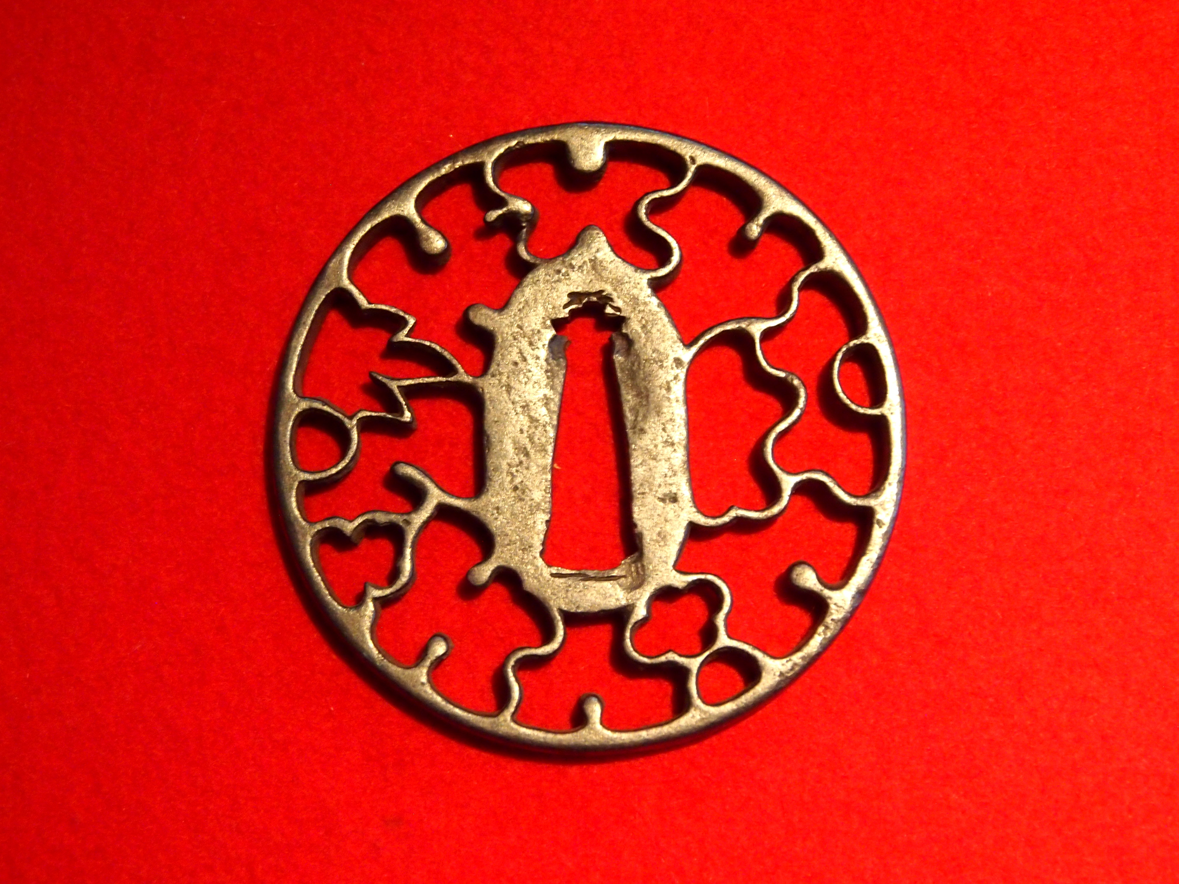 金山鐔は尾張国の地にて室町中期頃から造られ、尾張鐔と同じく戦国時代の武士に非常に寵愛された。特徴は中低となりやや小ぶりで厚手、耳には点状の鉄骨が現れ、 図柄は幾何学模様の透かしが施される。本作は比較的に大ぶりながらも地鉄に古雅が感じられ金山鐔特有の造り込みとなっており時代を感じさせる鐔となる。