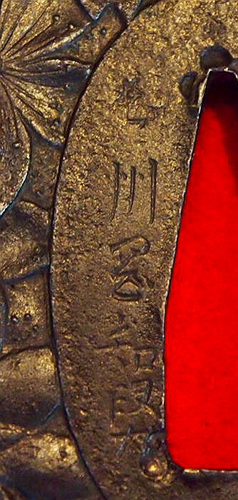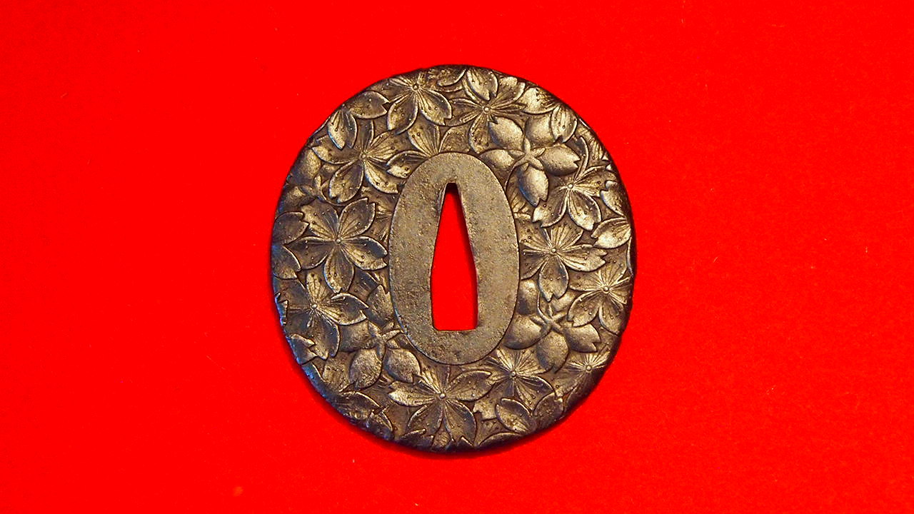長州鐔は藩公毛利家のもと藩の財源の一つとして製作を奨励され、古くは中井、河治、岡本家が長州に在住し、他に中原、八道、井上家等が続き、京の埋忠家の末裔も在住した江戸期における鍔の一大生産地である。 知賢(ともかた)は岡本家五代目で毛利家から藩工として扶持米を支給され江戸にも出て伊藤家で修業する。本作はよく鍛えられた鉄地に全面に桜が彫られ岡本家五代目としての技量が発揮された格調のある鐔となっている。