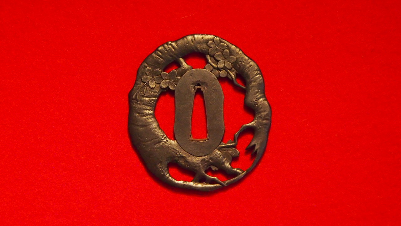 本作は鍛えの良い鉄地に力強い桜の樹の幹に鮮やかに桜が咲き誇っている様子が全面に配されている。無銘、長州極めとなっている。