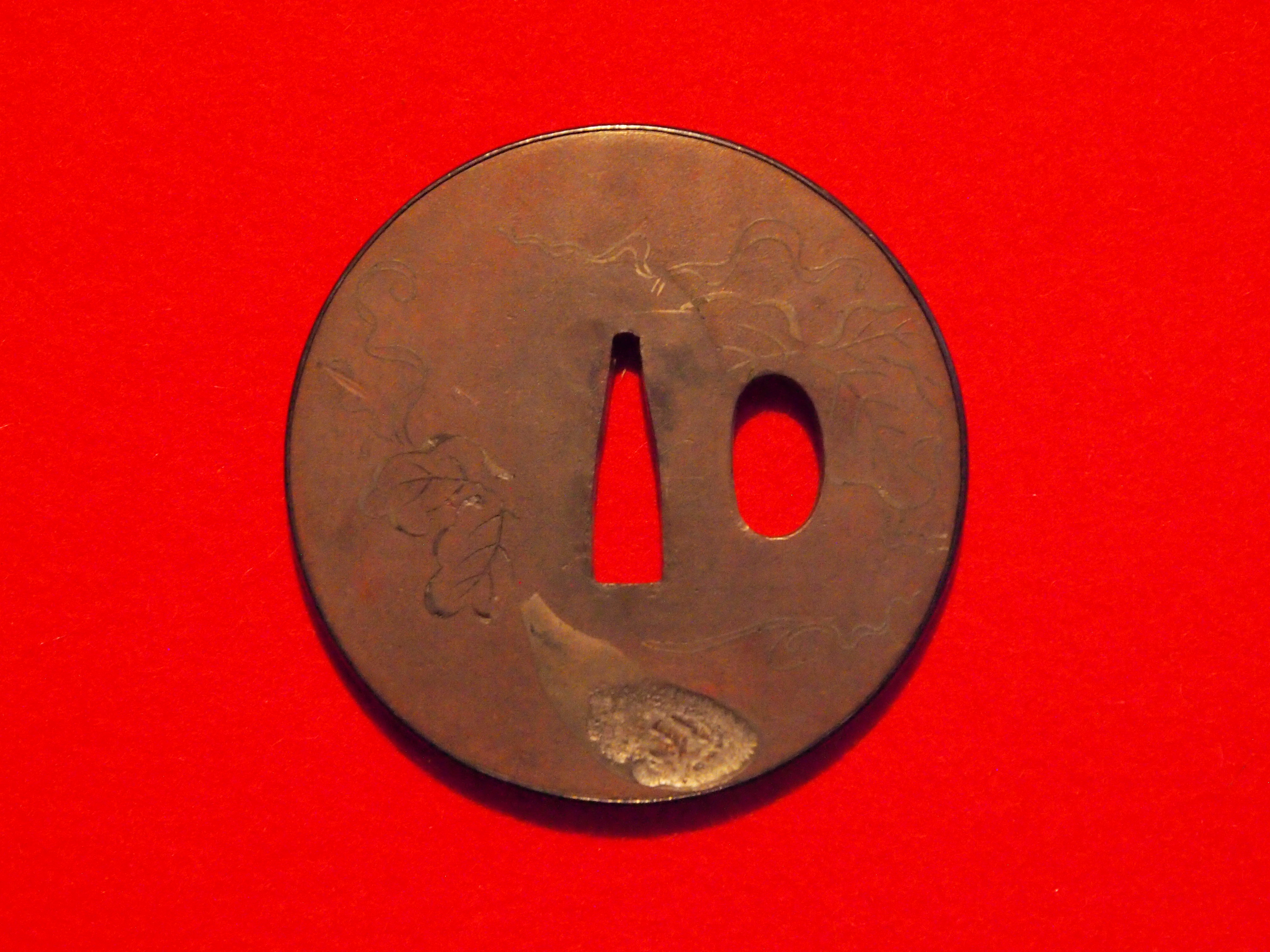 間は鐔工の名字。元は近江国国友村の鉄砲鍛冶で時代の潮流で廃業し、そのうち伊勢亀山に移住した工人が銃身に施した象嵌技術 を転用し、古い時代の砂張の地鉄を用いて鐔を作成した。間とはおそらく近江蒲生郡の地名といわれている。本作は素銅地に砂張象嵌、菊の毛彫りを施し、 茎穴右上に細鏨で間と切られ古色ある風合いの鐔となっている。